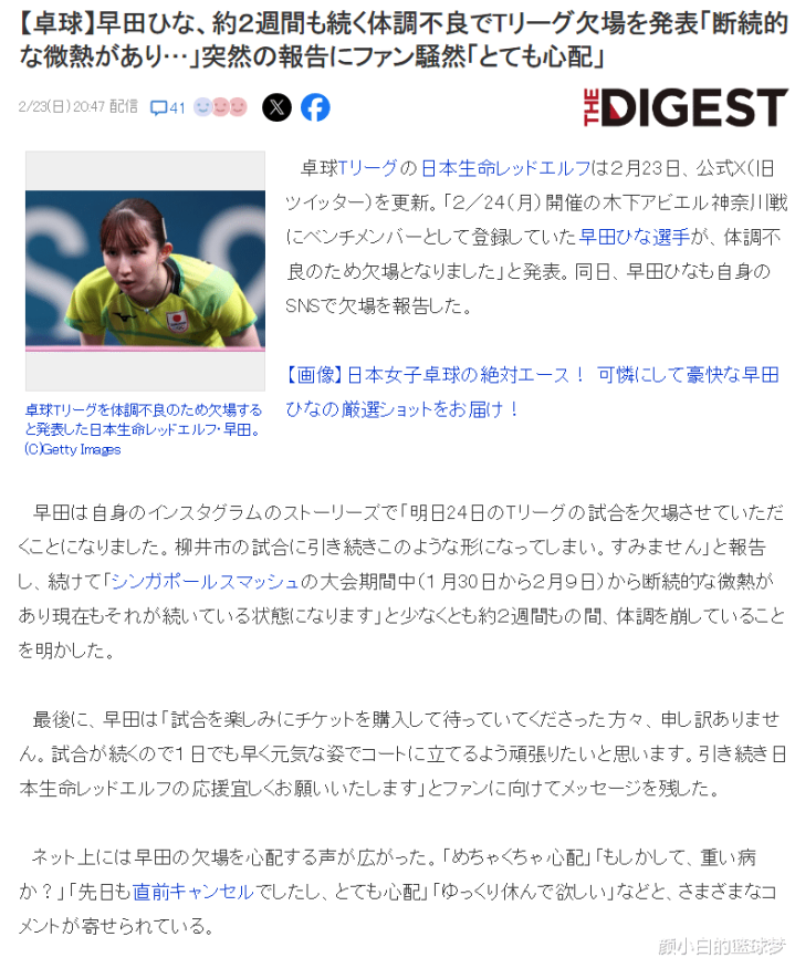 对此早田希娜在个人INS上发布了说明:“在新加坡大满贯期间自己就开始断断续续的发低烧,发低烧的状态从1月30日持续到2月中旬,自己也在身体不适的情况下与中国选手鏖战1小时16分钟败北。两天前刚刚结束的亚洲杯也与中国选手陈幸同打了五局,自己的身体有些支持不住。对来看我打球的粉丝说一句抱歉,我会尽快康复重返赛场。”